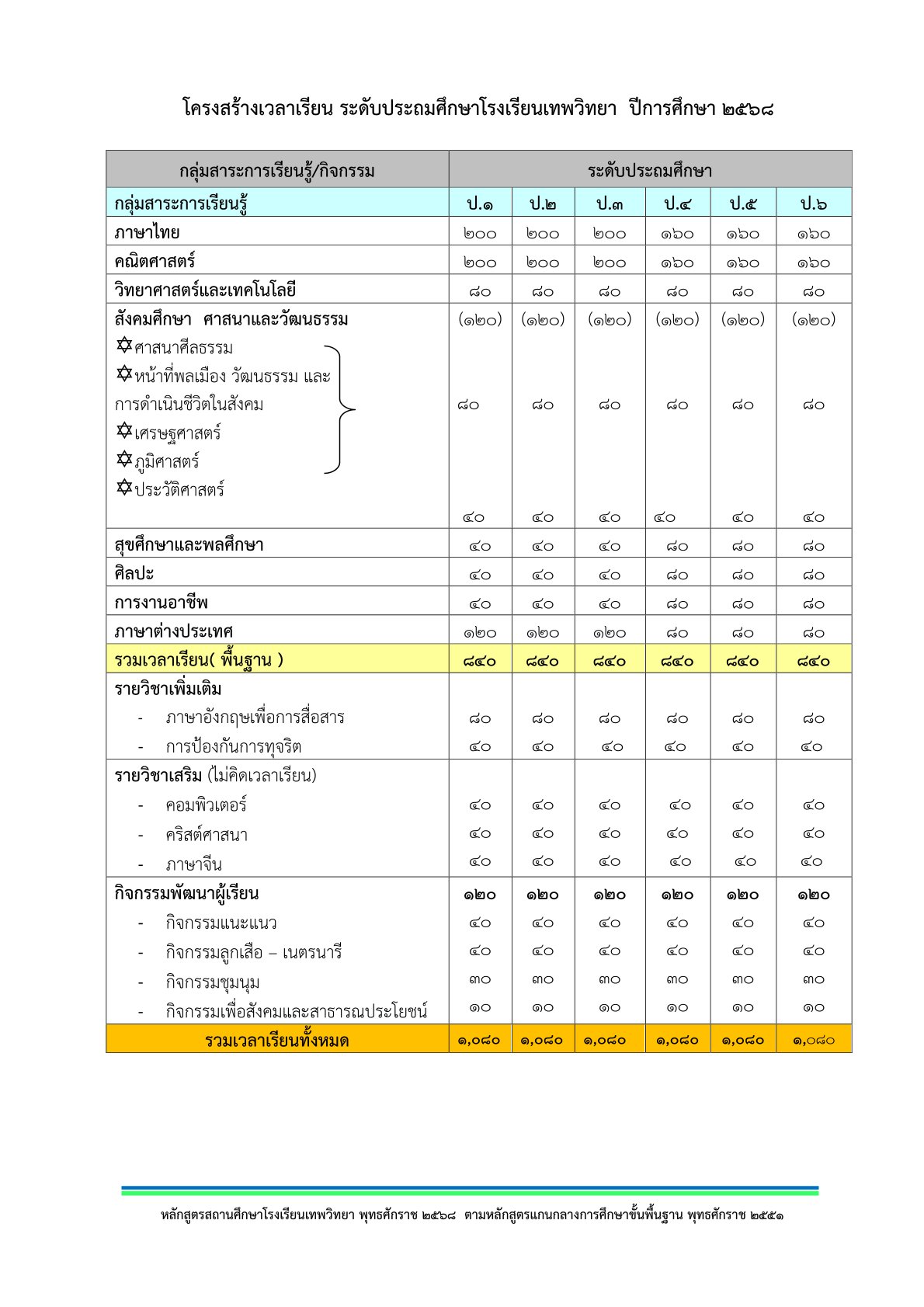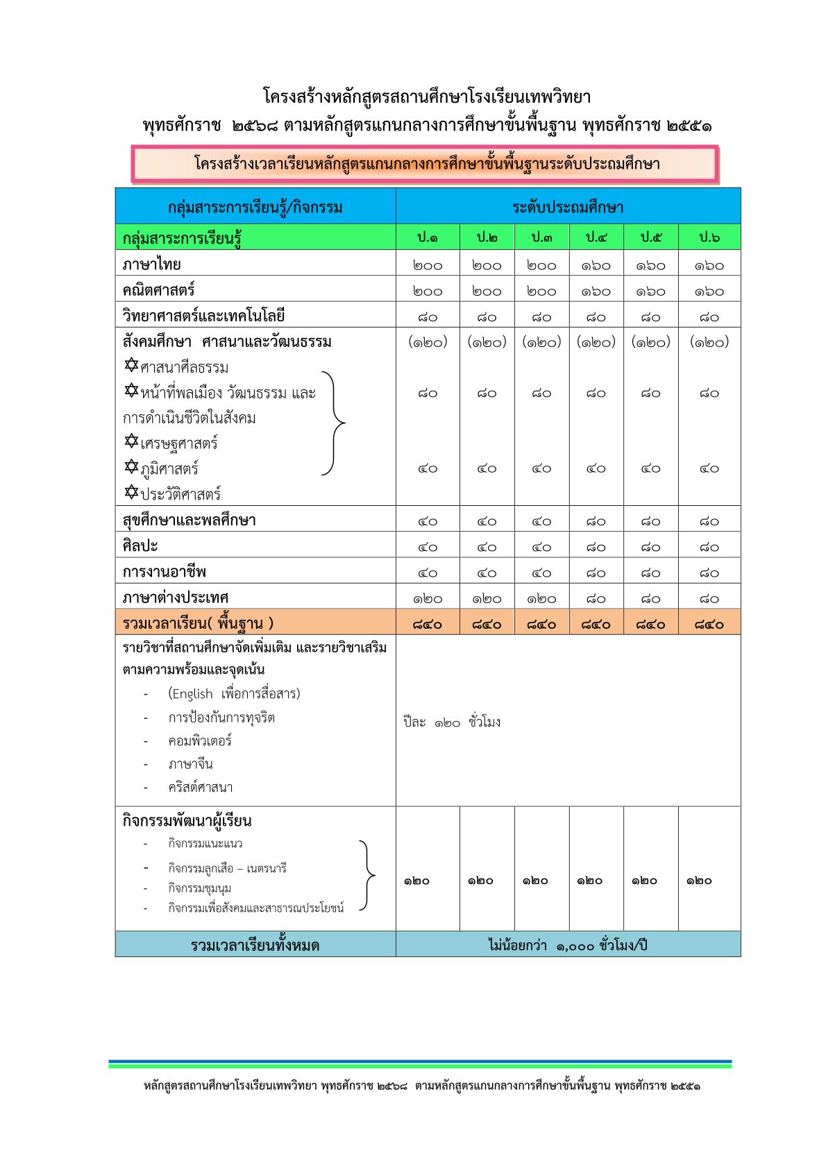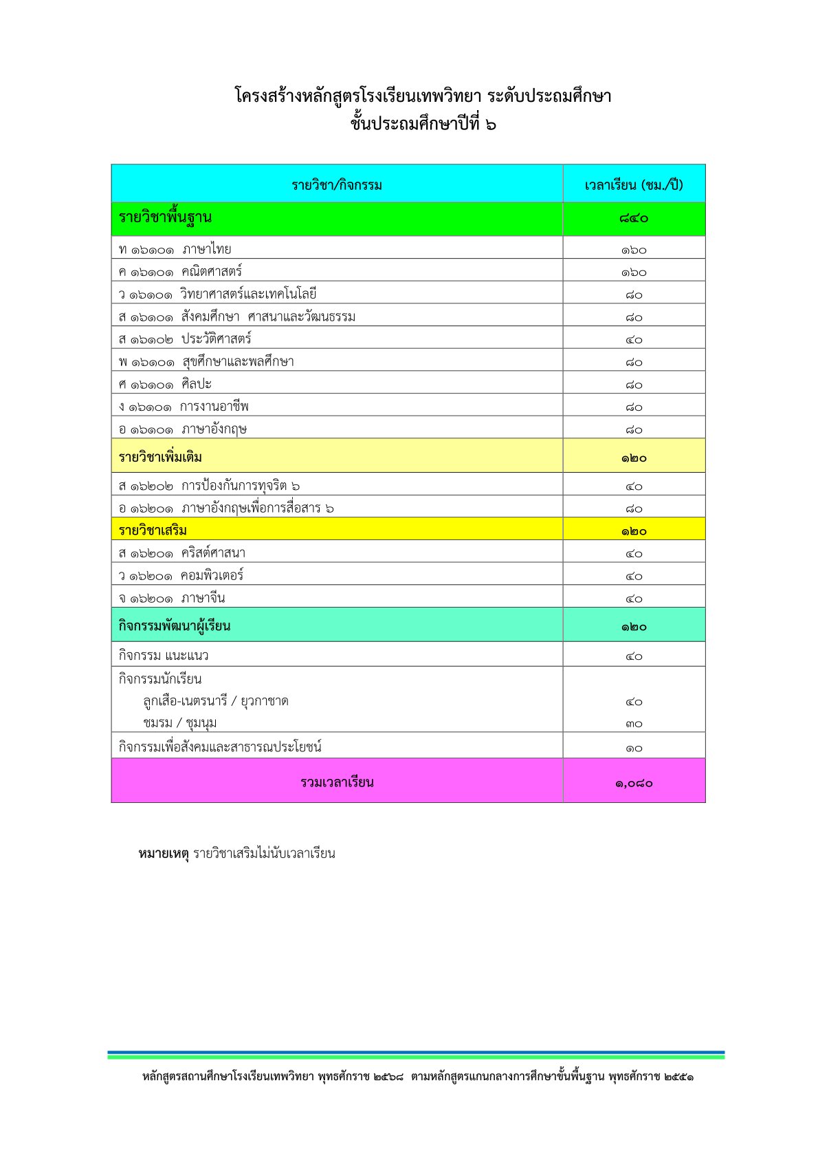 โครงสร้างหลักสูตร ประถมศึกษาปีที่ 6